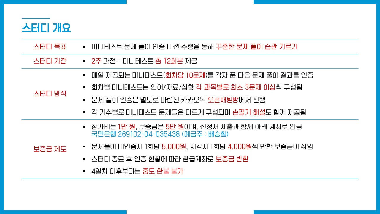 - 스터디 참여 독려를 위하여 보증금 제도를 실시합니다('참고사항' 참조).
