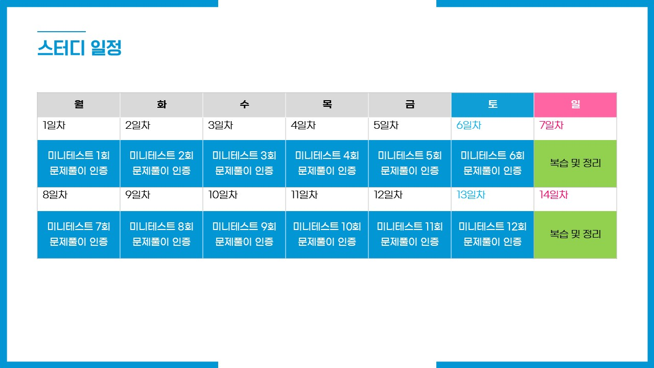 이 과정은 온라인으로만 진행되며, 매일 제공되는 미니테스트를 풀고 오픈채팅방에 인증하는 방식으로 이루어지는 스터디입니다.