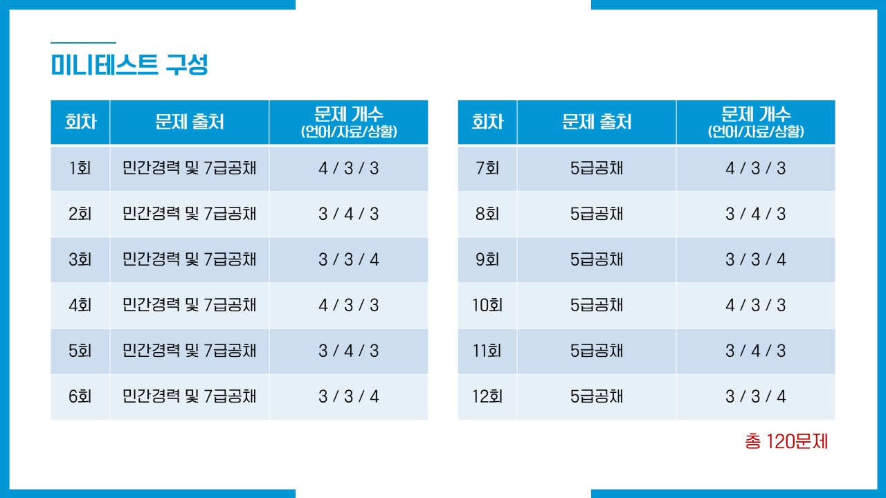 - 미니테스트는 회차별로 10문제(언어/자료/상황)씩 총 120문제로 구성됩니다.