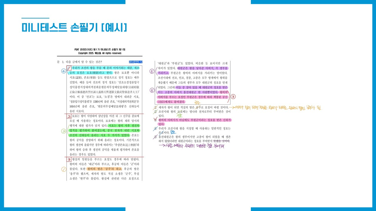 - 스터디 기간 동안 매일(일요일 제외) 미니테스트 및 손필기 해설자료가 제공됩니다.